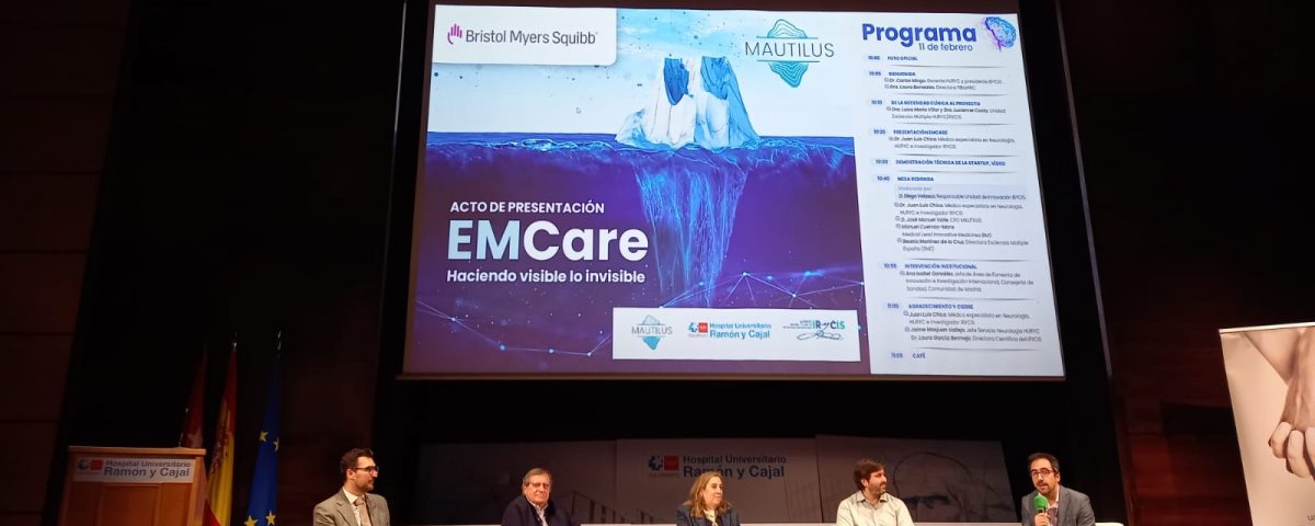 El pasado miércoles 11 de febrero, en el Salón de Actos del Hospital Universitario Ramón y Cajal (HURYC), tuvo lugar la presentación institucional de Mautilus Ehealth SL, spin-off del IRYCIS. En el marco de un acuerdo de colaboración con la compañía biofarmacéutica Bristol Myers Squibb (BMS), se presentó además EMCare, una aplicación móvil pionera orientada a impulsar la innovación digital en el seguimiento de la Esclerosis Múltiple (EM).